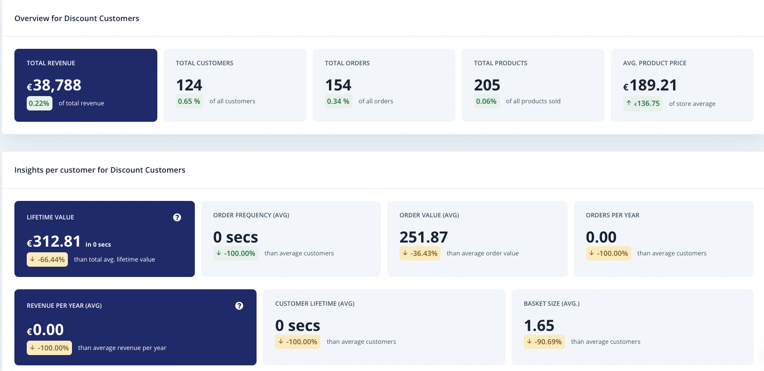 In this example, the frugal customer’s Audience has a lifetime value that is 66% lower when compared to the overall customer average. Also, the average order value in this segment is lower than the overall average and the revenue per year is equal to 0.