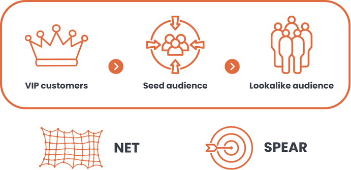 The flow works like this: take your VIP customers (repeat buyers, high lifetime value), use them as a seed audience, and let platforms like Google and Meta find other people who behave in similar ways. This narrows the pool you're bidding in and reduces competition.
