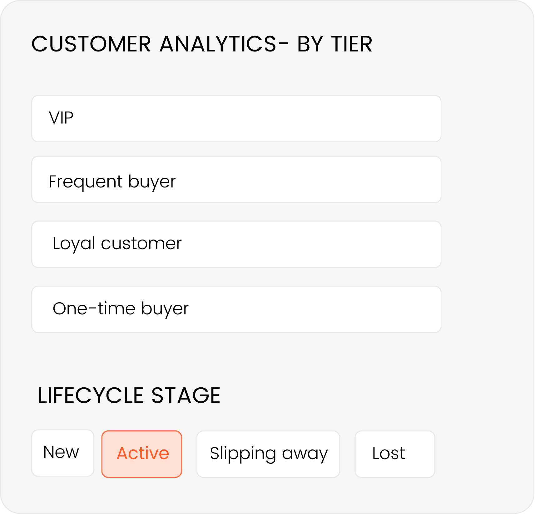 Customer Analytics sorts every shopper into purchase-frequency tiers and lifecycle states, so you can compare audiences side by side and pick the right one for each campaign.